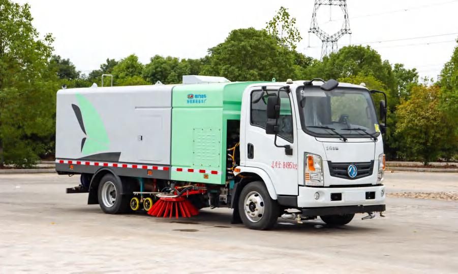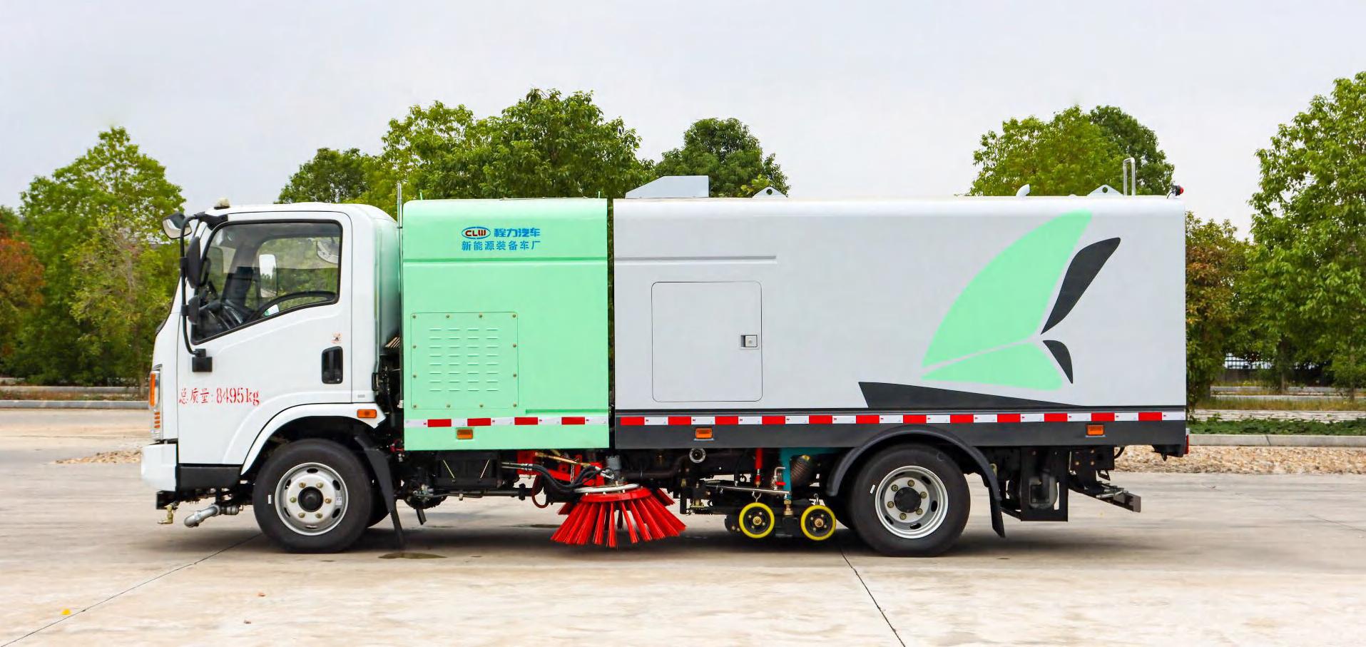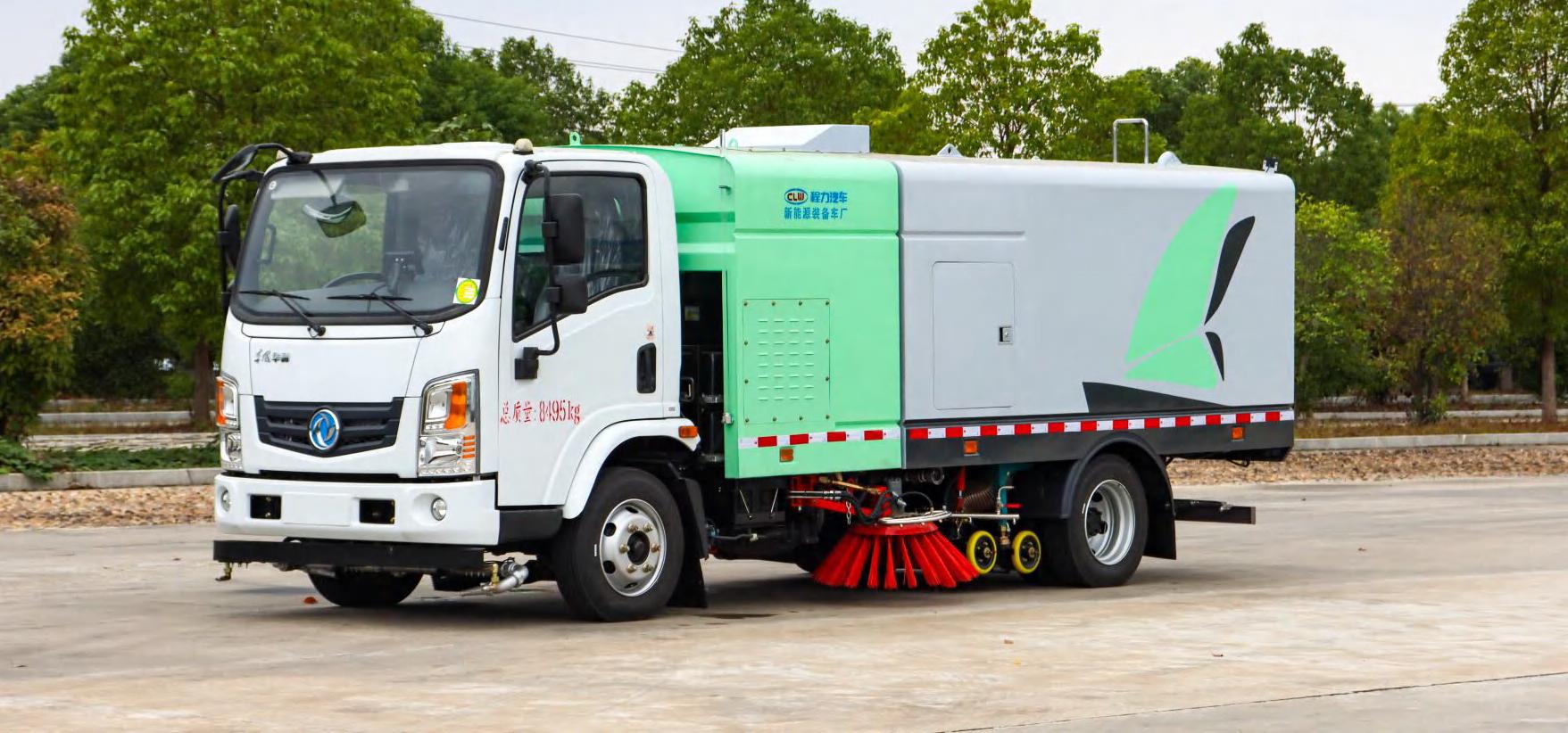 四、其他說明: 程力汽車股份有限公司環衛車系列東風華神純電動洗掃車是我公司自行設計開發、具有自主知識產權、 國際領先技術水平的新一代路面、路沿清洗、清掃及噴霧降塵的專用設備。該款洗掃車結合了掃路車及高壓 清洗車的功能特點,并解決了吸塵車無法在城市道路上清洗路沿的短板,在作業時利用掃刷將地面垃圾掃向 車內側。
