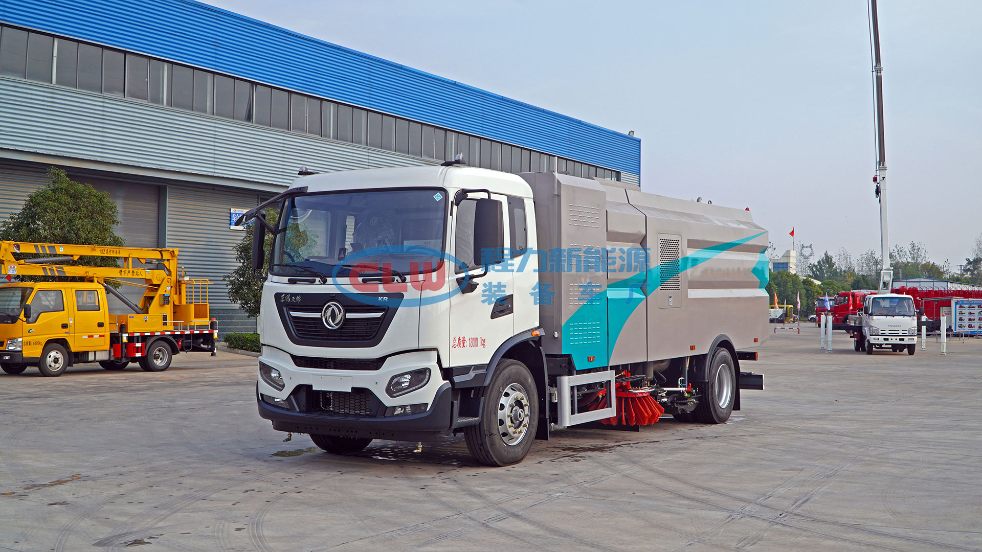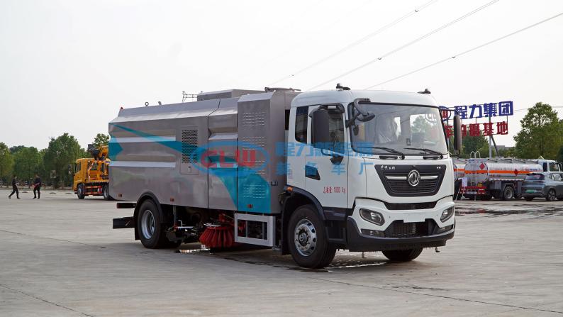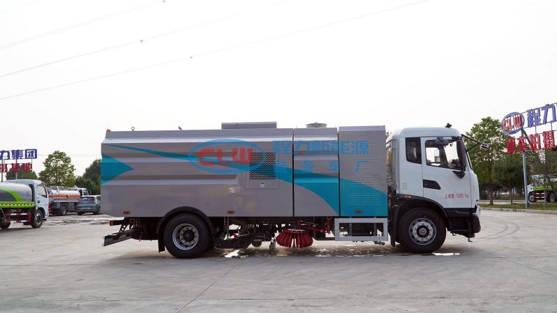 該洗掃車采用純電動二類底盤改裝、風機、清水箱、垃圾箱、左右立掃、掃盤降塵系統、左右高壓側噴高、吸盤內置高壓主噴桿、氣動系統、液壓系統、專用裝置電控系統和副車架等改裝而成。
