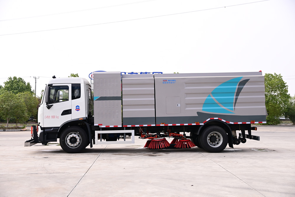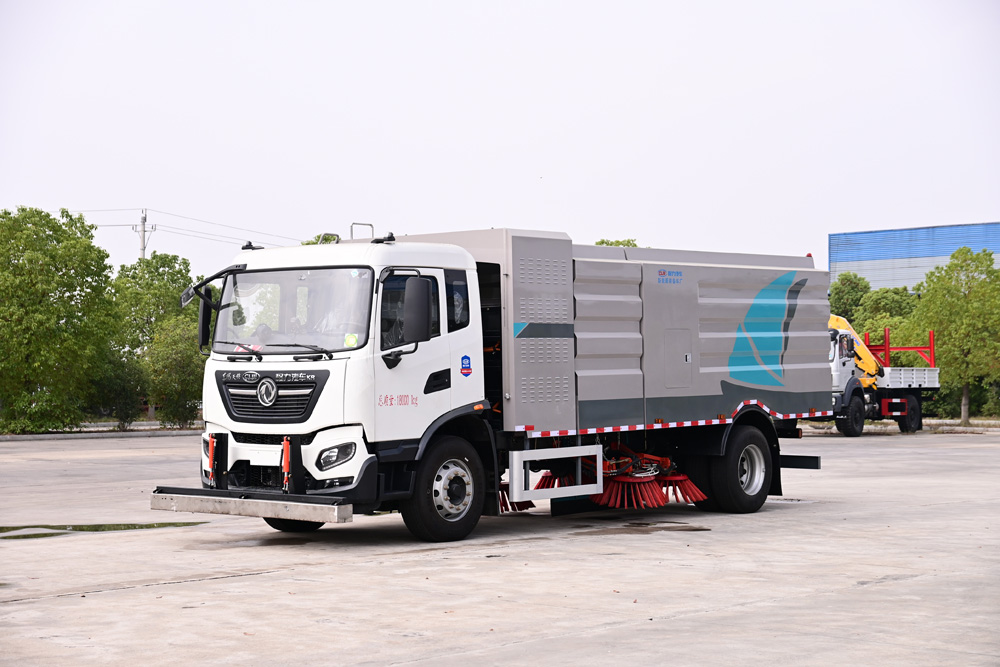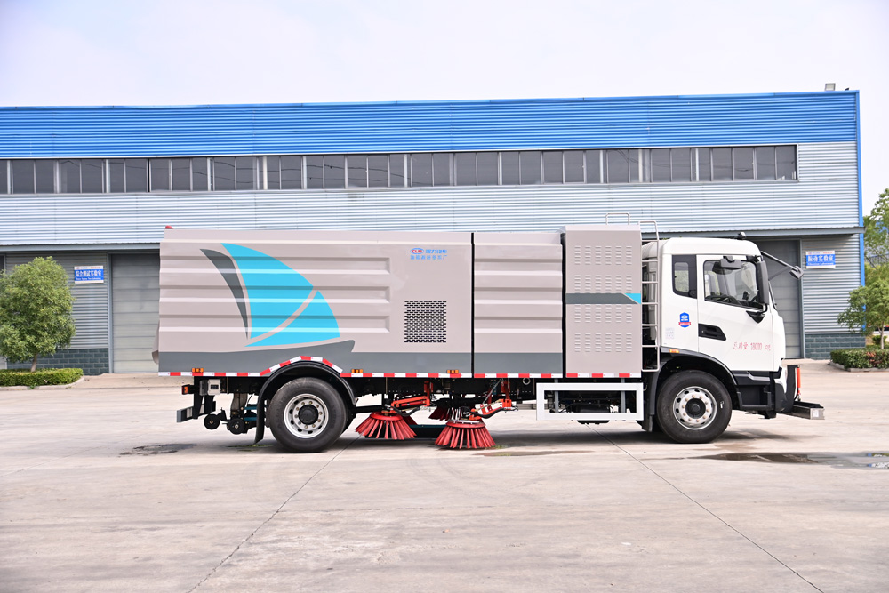 3、掃路車采用東風(fēng)純電動二類汽車底盤改裝,加裝風(fēng)機(jī)、清水箱、垃圾箱、左右立掃、掃盤降塵系統(tǒng)、液壓