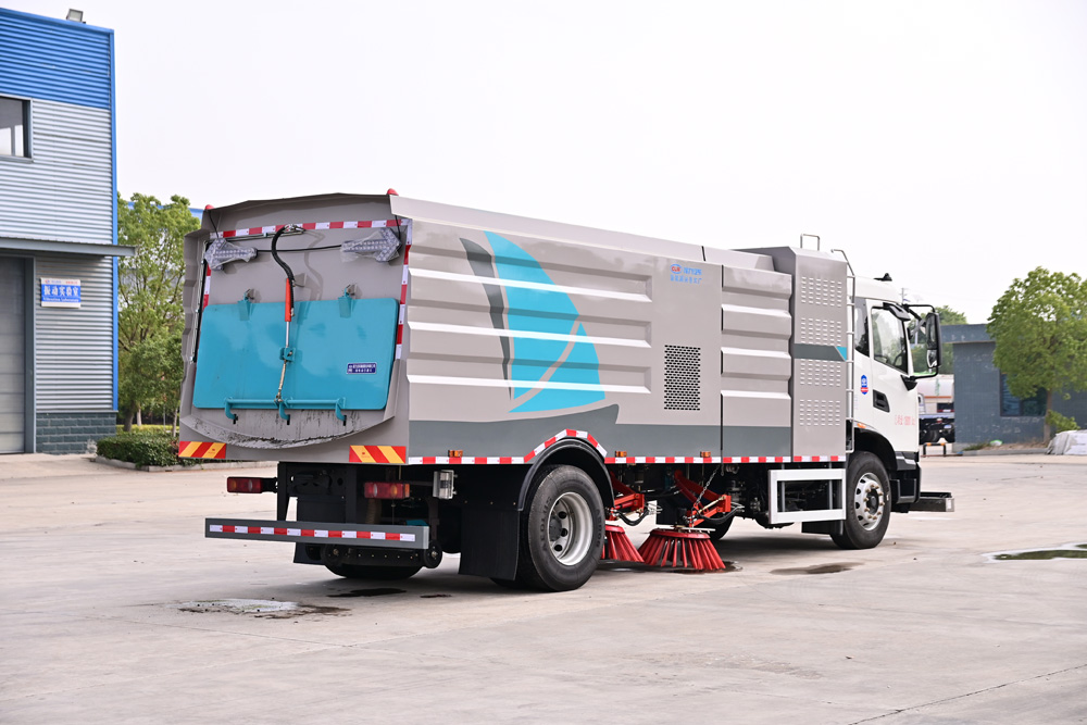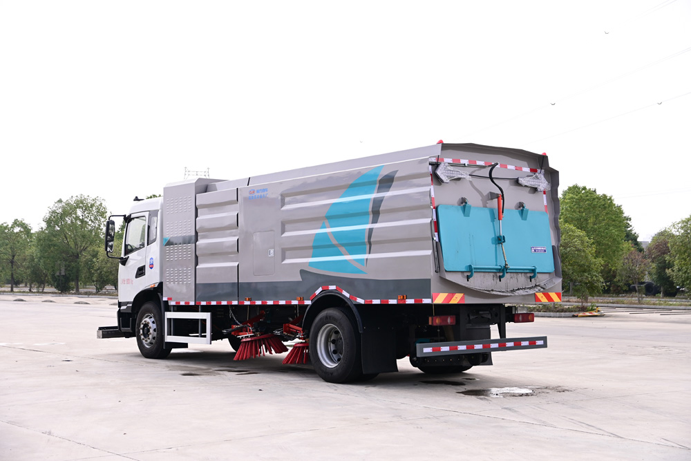 5、左右立掃為雙掃盤。開放式液壓系統(tǒng)驅(qū)動左右立掃升降、左右掃盤旋轉(zhuǎn)、吸嘴升降、垃圾箱后門開閉、垃