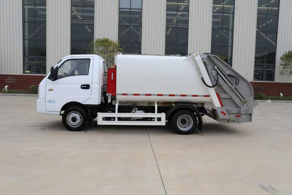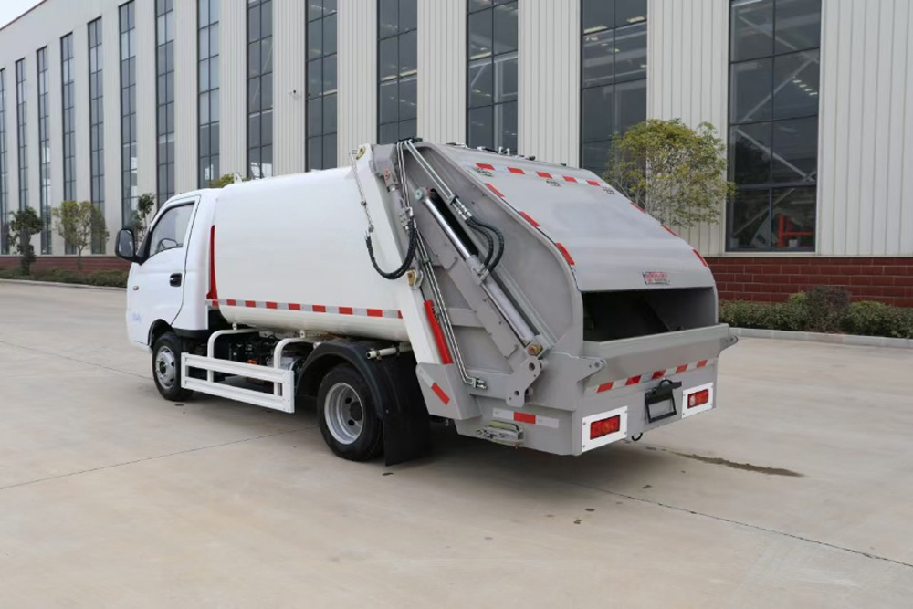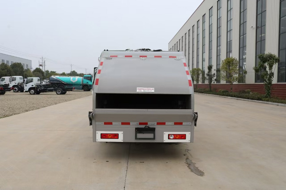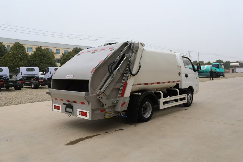 四、其他說明: 涂裝采用噴粉加烤漆工藝。箱體容積3 立方米,為高強度鋼制作的弧形無泄漏船型箱體,頂部有刮滑板,防止垃圾泄漏和異味擴散。液壓系統采用國產油缸、睿宸油泵、揚州中梅多路閥。后帶翻桶架,可掛 2 只國標 240L 方塑料桶,提升機帶無線遙控。填裝器舉升油缸帶平衡閥,帶氣動密封蓋,填充器底部有污水箱,還配備作業后支腿和電控限位感應系統。