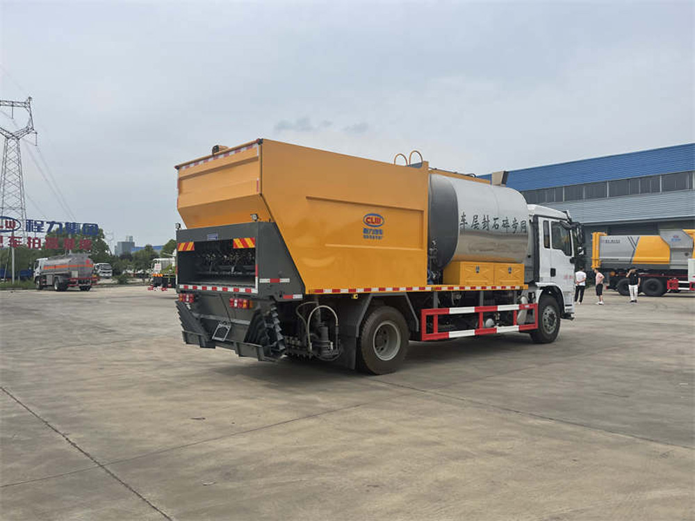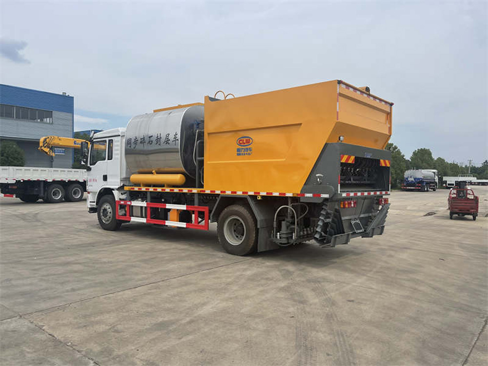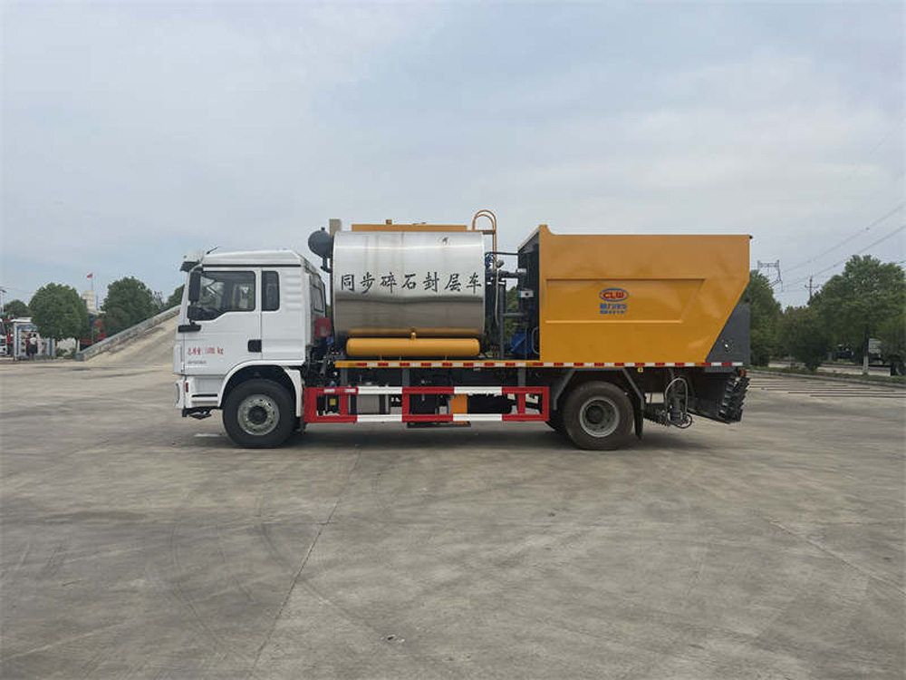 該車特點 同步碎石封層是指利用同步碎石封層車將瀝青結合料的噴灑和石料的灑布同時進行,使瀝青結合料與石料之間有最充分的接觸,以達到它們之間最大限度的粘結度。其更容易保證粘結劑和石料之間穩定的比例關系,提高作業生產率,減少了機械配置,降低了施工成本。