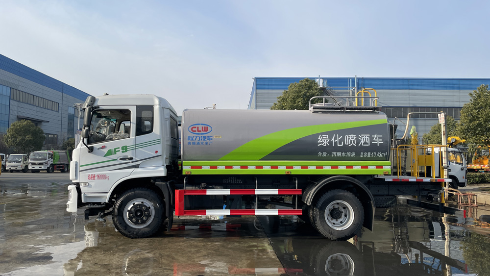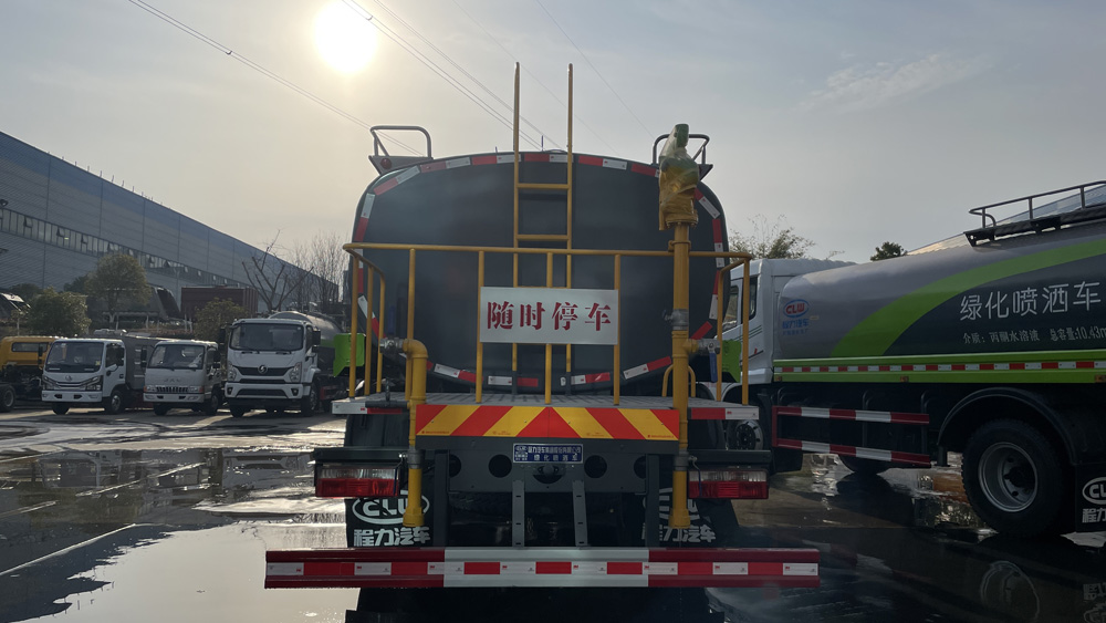 三、選裝配置: 選配駕駛室內電控氣動操作;大鴨嘴前沖噴頭壹對;萬向前沖球閥;路面沖洗水管卷盤;本田高壓水泵,水槍可沖洗人行道、移動洗車等; 藥盤;長警燈,LED箭頭燈;罐側帶閘門,罐后加裝噴霧降塵裝置;灑水車泵標配程力泵選配杭州威龍泵;可對主管道加粗,可選316大口徑球閥;罐體內防腐、保溫、襯塑處理,灑水車作運水車用可加裝自流口。運熱水罐體可做保溫,運生活用水可做食品級304不銹鋼罐體。